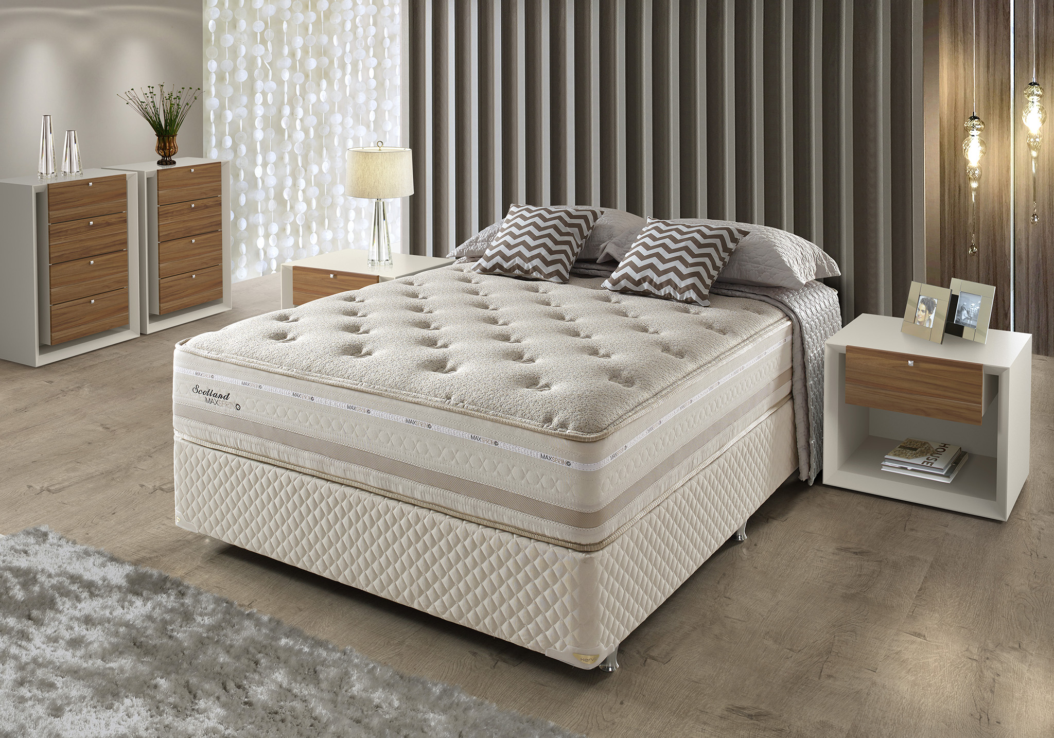O Colchão SCOTLAND, da consagrada Linha Vivere, é ideal para quem busca firmeza com conforto extra. Com 33 cm de altura, possui Pillow Top em um lado, garantindo um toque macio sem abrir mão do suporte. A tecnologia de molas Maxspring proporciona excelente sustentação e adaptação ao corpo. Seu revestimento em malha macia e a base em Suede 011399, com espuma de alta performance (Ecospuma), conferem sofisticação e durabilidade ao conjunto.