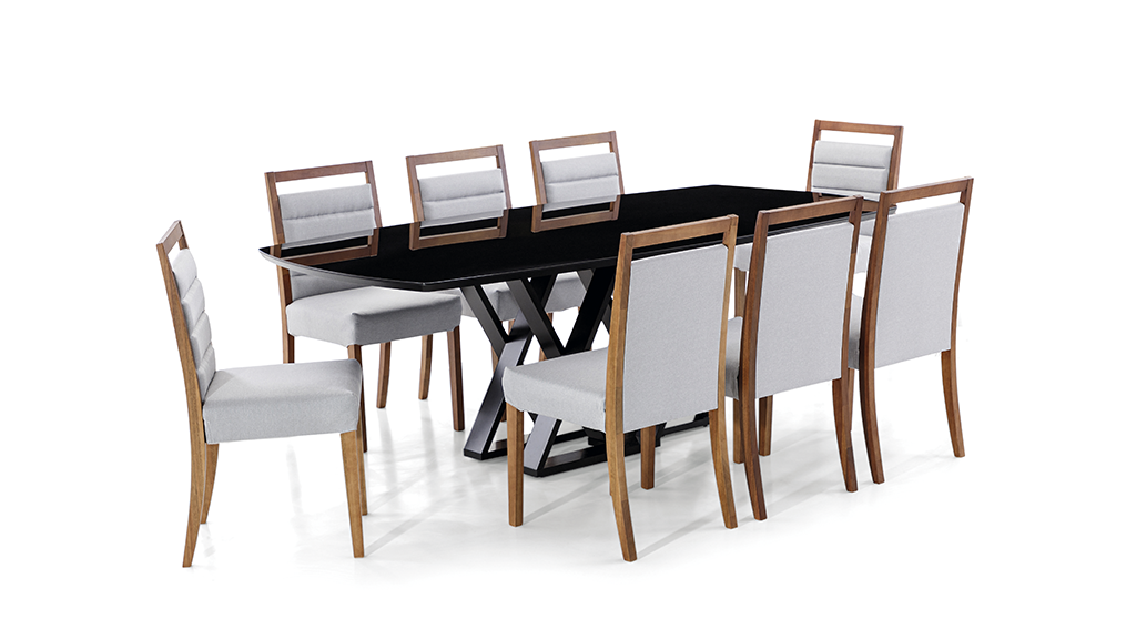 A estrutura robusta proporciona estabilidade, enquanto o tampo de vidro eleva o visual do ambiente, conferindo leveza e elegância. A mesa acomoda confortavelmente de 6 a 10 lugares, dependendo da medida escolhida.