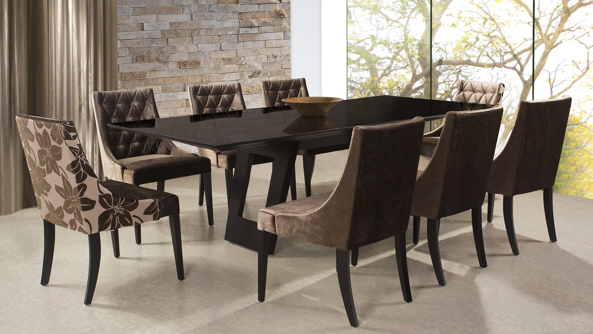 Pés robustos e levemente inclinados, com acabamento natural ou tingido, reforçando a estabilidade e o visual elegante.